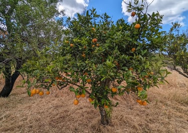 2'500m2 de terrain joliment arboré d'une cinquante d'arbres et arbustes locaux. Les senteurs des citrons, oranges, mandarines sont irrésistibles. Promenez-vous dans le verger et ramassez à votre guise les fruits mûrs directement sur les arbres. Rien de tel qu'un jus de fruits frais le matin au réveil. Nous ne traitons pas nos arbres chimiquement. Nous ne les arrosons pas. La nature est magique et ces essences locales s'adaptent très bien aux sécheresses d'été en comptant sur les pluies et l'humidité relative de l'hiver.