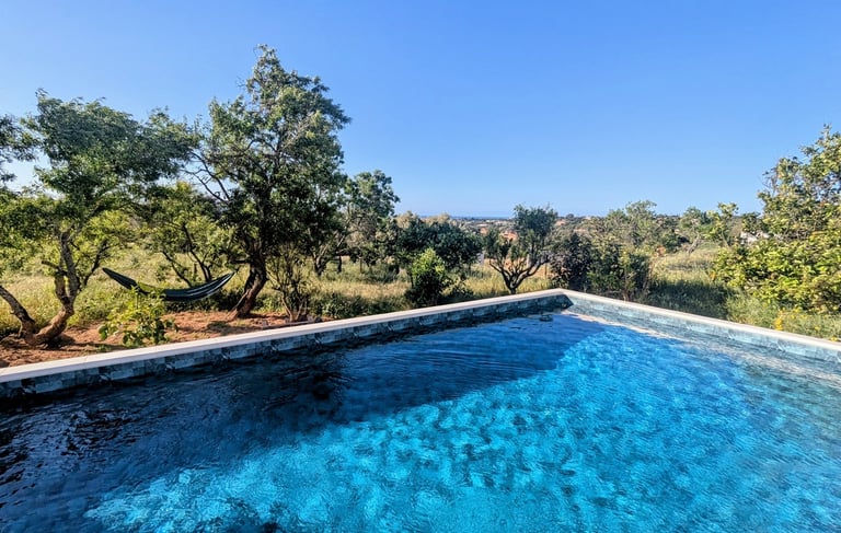La piscine se dresse au milieu d'un verger d'amandiers, de pruniers, de mandariniers, d'orangers, de citronniers, d'oliviers, de grenadiers, de figuiers et d'autres fruitiers. Plus en aval du terrain fut planté un champs d'oliviers au milieu de vieilles vignes.